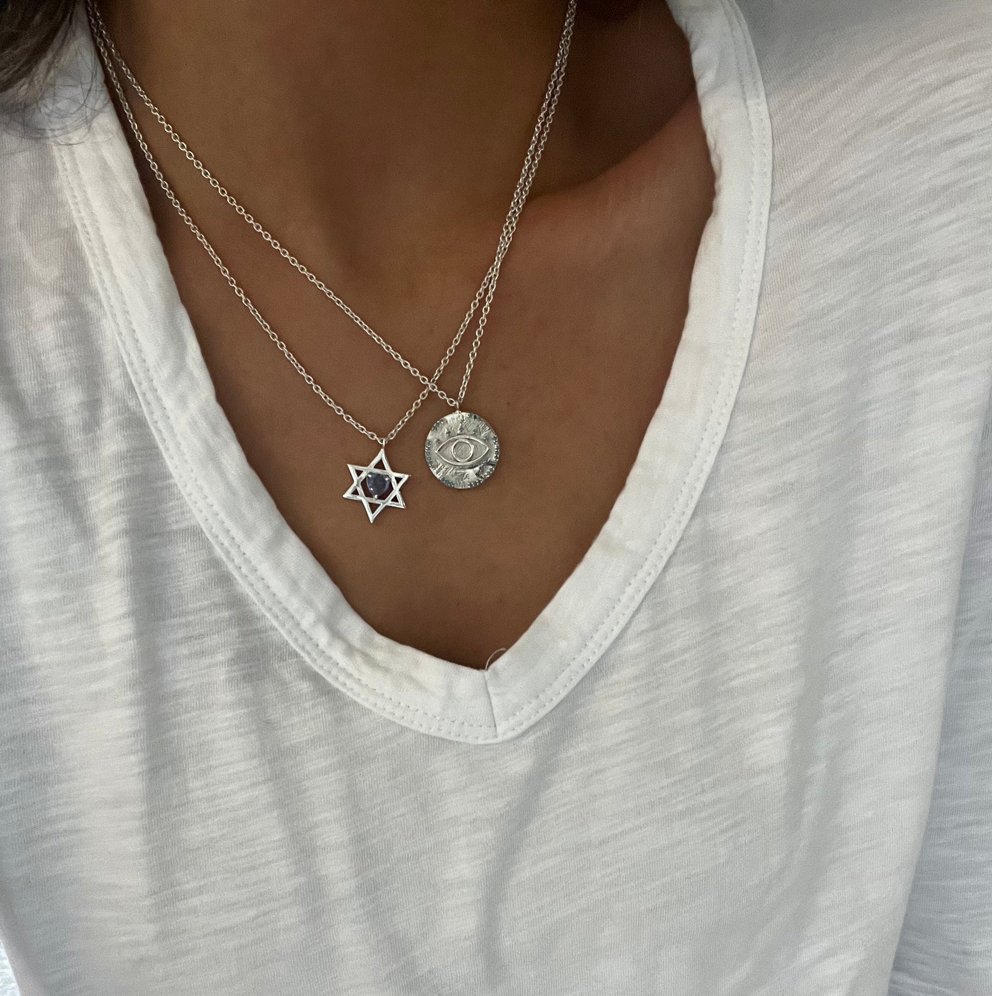 A silver coin necklace featuring an engraved eye set with natural turquoise stones — a timeless symbol of protection and style.
